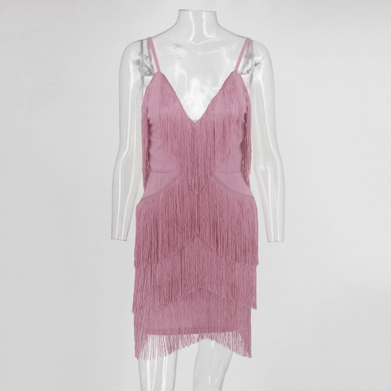 Lujoso mini vestido de mujer decorado con flecos.
