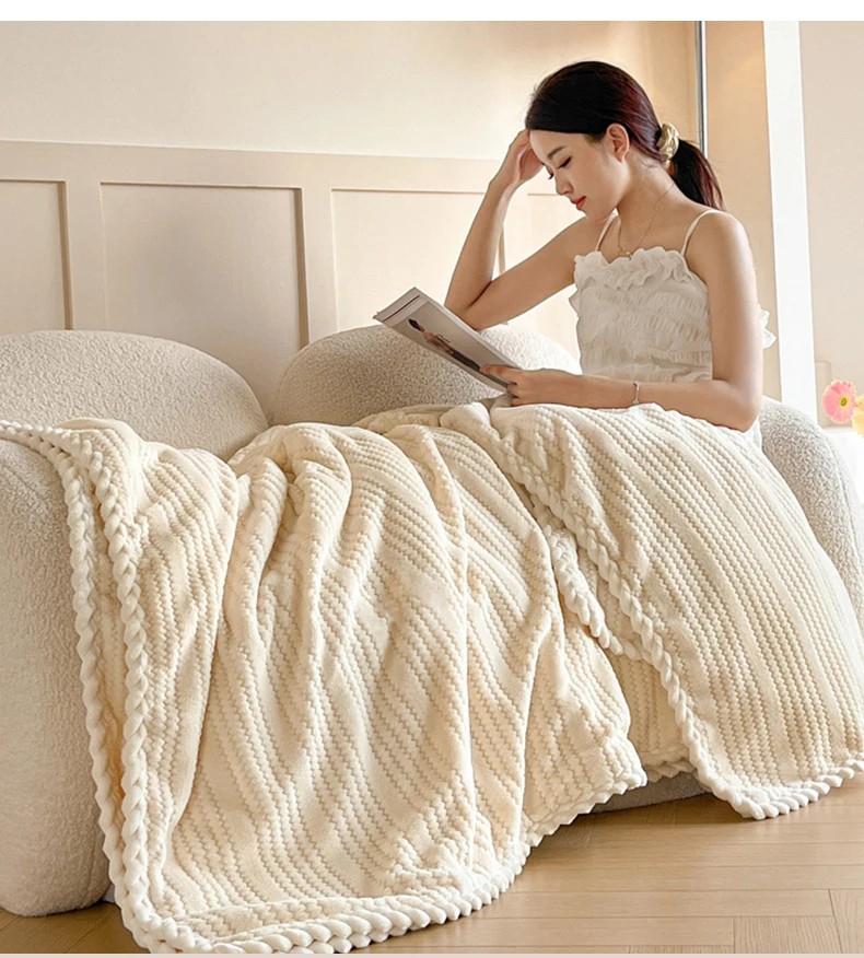 El relleno es suave y esponjoso, por lo que puedes envolverte cómodamente en la manta mientras ves películas por la noche, lees o descansas después de un día agotador. La cara frontal se siente lisa y suave, mientras que la parte trasera está compuesta por un denso pelo que asegura un rápido calentamiento. Los bordes de la manta están cuidadosamente rematados con un ribete decorativo que previene el deshilachado y resalta la calidad general del acabado. La manta está diseñada para mantener su forma, esponjosidad y suavidad a largo plazo, incluso después de un uso y lavado frecuentes. El material es agradable incluso para pieles más sensibles y adecuado para el uso diario en el dormitorio y la sala de estar.