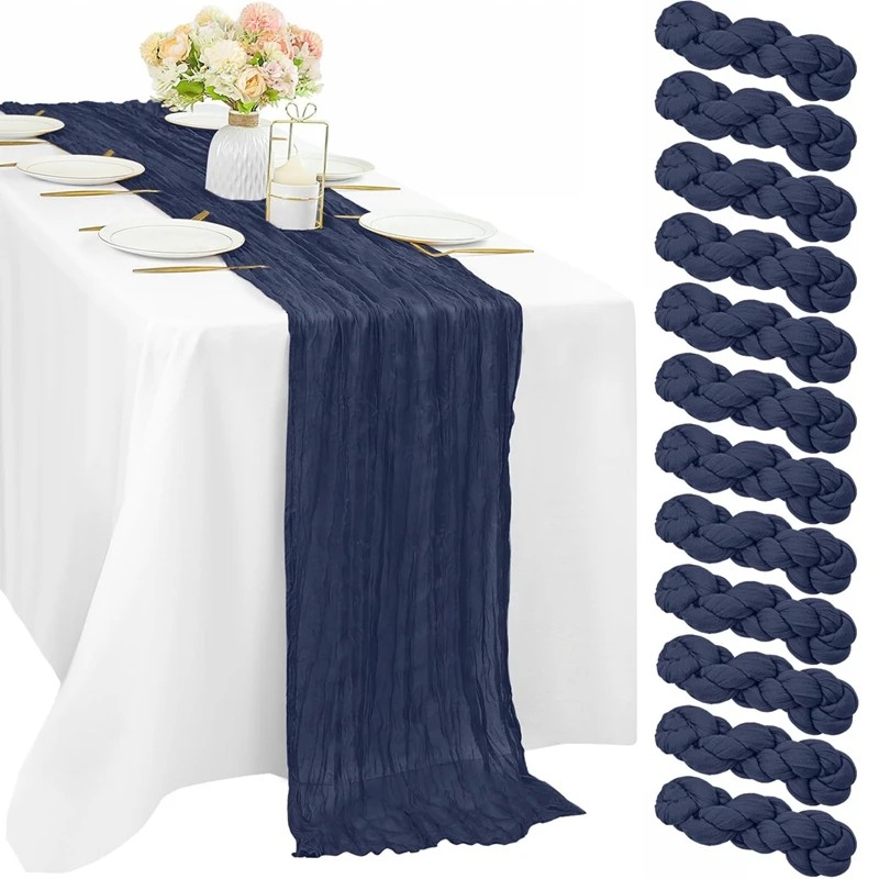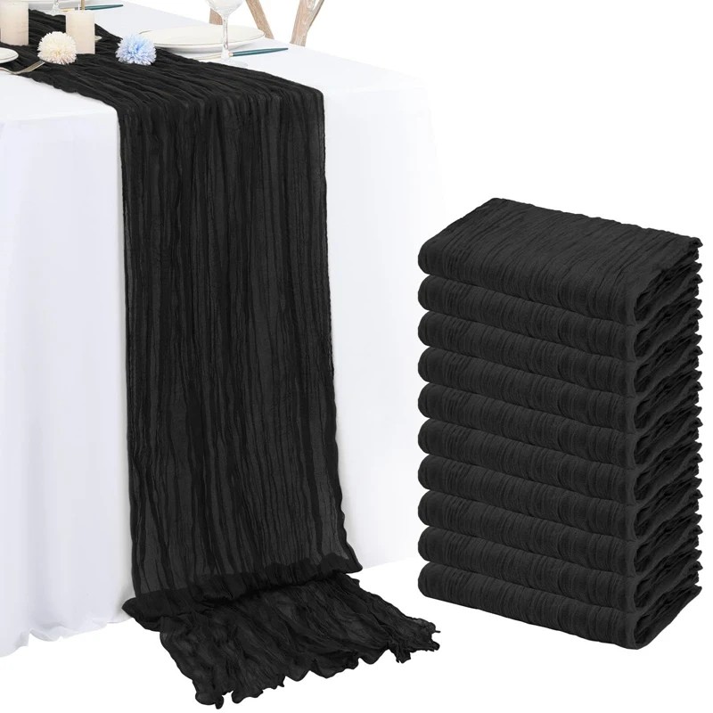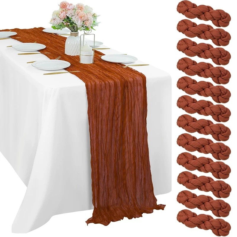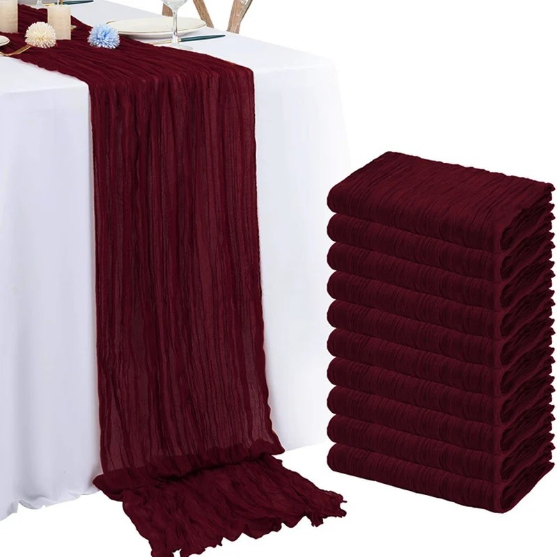 El material está compuesto por tela ligera con estructura de gasa, que crea una apariencia natural y ligeramente arrugada. Este tipo de tejido se utiliza a menudo en la decoración de mesas en estilo campestre o rústico. El mantel puede proporcionar un aspecto suave e informal a la decoración de la mesa.