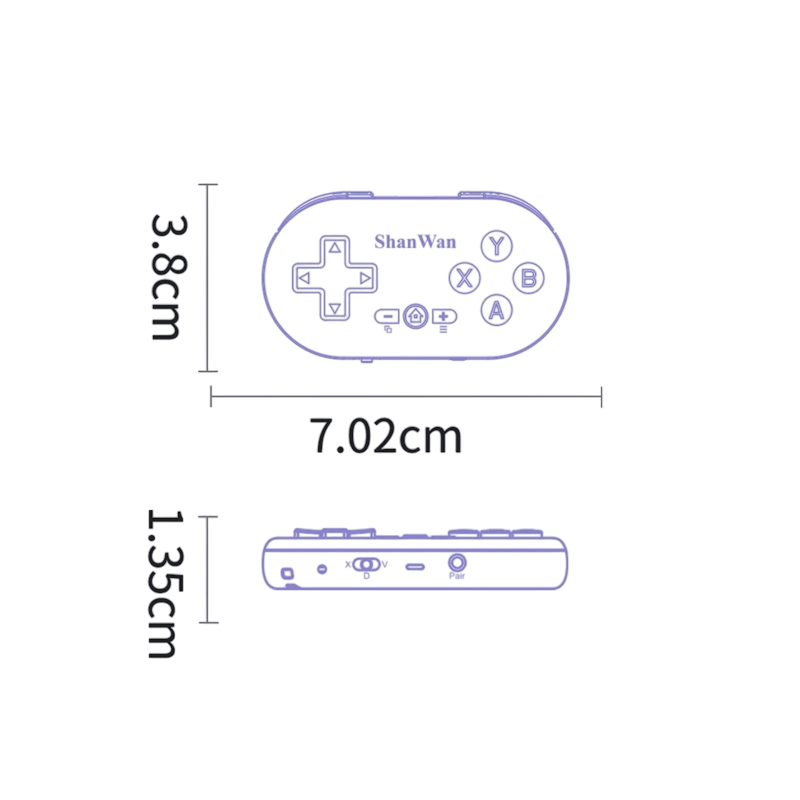 - Contenido del paquete: mini controlador de juegos, correa para colgar, manual de usuario.