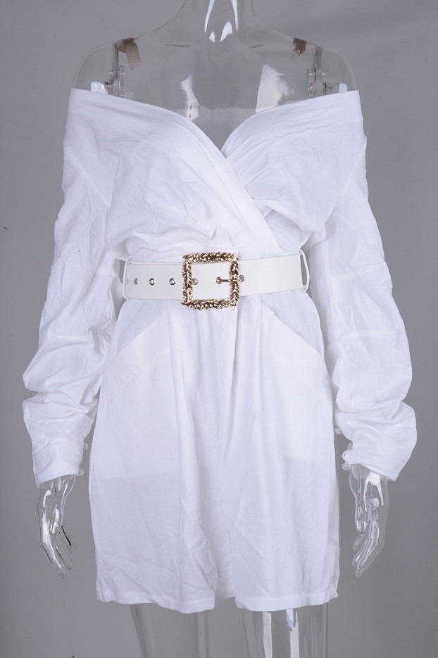 Vestido mini de mujer con mangas largas y hombros descubiertos.
