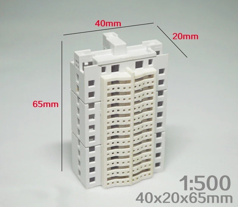 El modelo tiene dimensiones de 40 x 20 x 65 mm y está hecho de plástico ABS de alta calidad, que es ligero y resistente. La escala 1:500 es adecuada para composiciones urbanas detalladas y grandes conjuntos arquitectónicos. El producto se entrega como kit de construcción, siendo necesario ensamblar las piezas individuales.