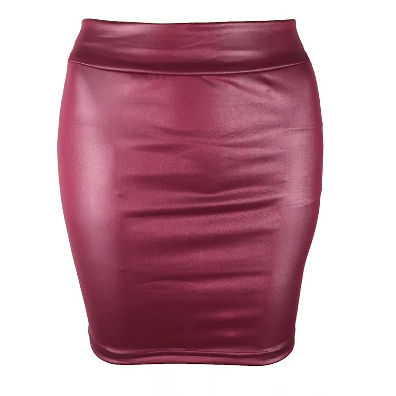Minifalda de mujer confeccionada en piel sintética brillante. Cintura alta. Corte ajustado. Look sexy. Elegante traje de noche. Falda elegante para fiesta y club.