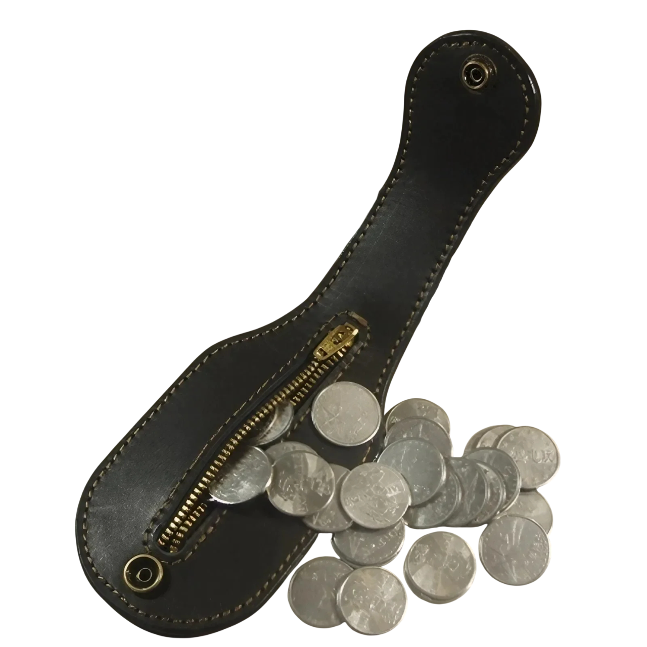 Práctico monedero unisex para monedas con cierre, solapa protectora y asa para el cinturón. Formato estrecho, cuero sintético y elementos de bronce. Descripción completa