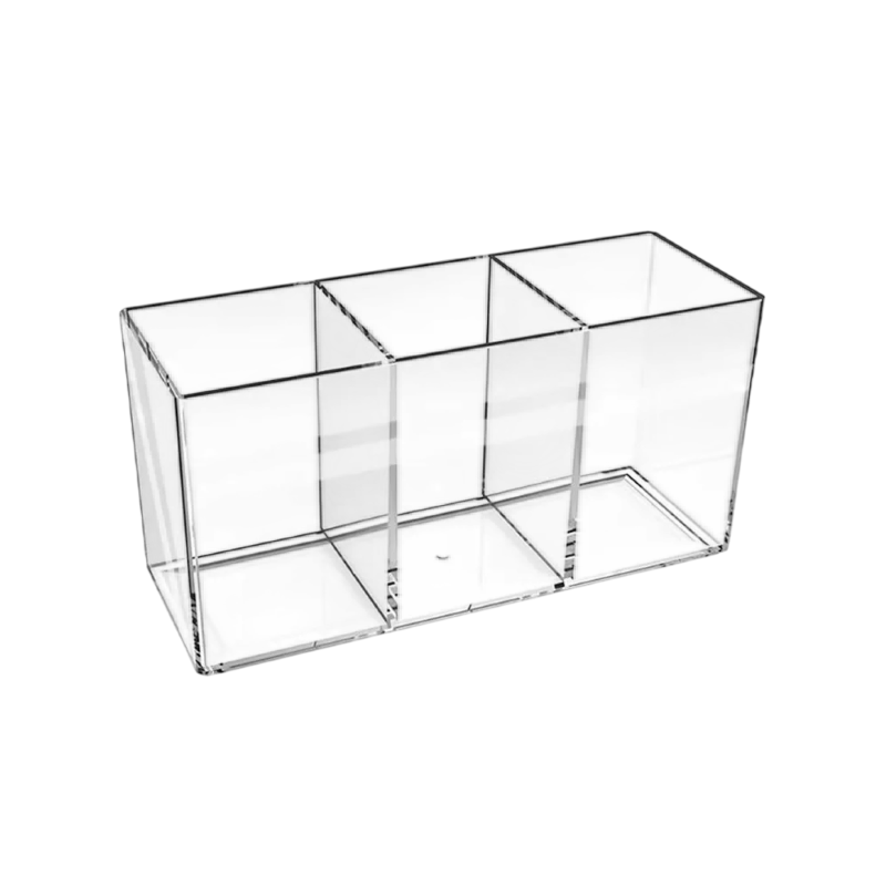 El organizador contiene 3 compartimentos separados, que son especialmente adecuados para brochas, lápices o labiales. Las dimensiones 9 x 6,5 x 18 cm permiten su colocación incluso en espacios más pequeños sin limitar la funcionalidad. Está fabricado en acrílico, que es ligero y práctico para el uso diario. La estructura sirve como soporte para brochas y accesorios de maquillaje, lo que amplía las posibilidades de uso. El diseño transparente ayuda a mantener la visibilidad del contenido almacenado.