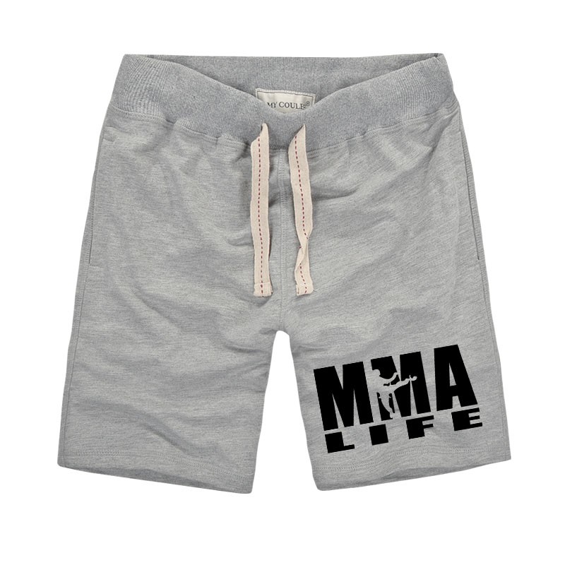 Los pantalones cortos tienen una inscripción MMA LIFE negra en la pierna.