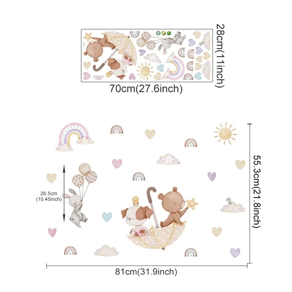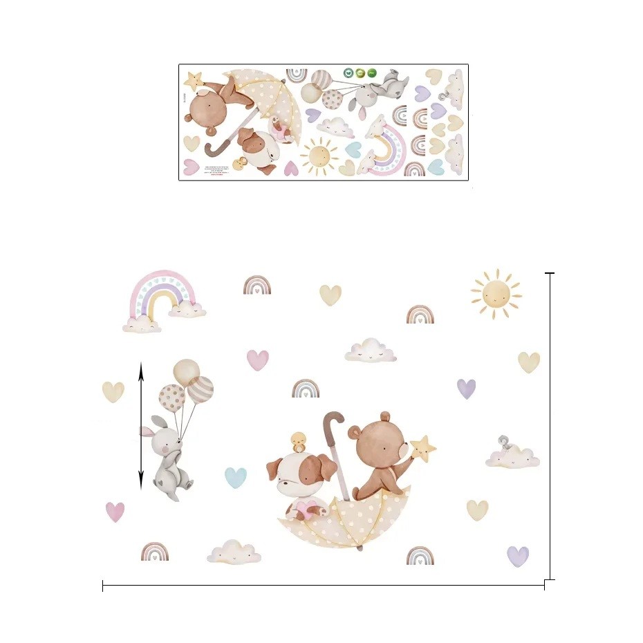 El motivo de los animales bajo el paraguas evoca una sensación de seguridad y bienestar, lo que es ideal para el entorno donde el niño pasa su tiempo. Los suaves tonos pastel se adaptan a una amplia gama de interiores y se combinan fácilmente con otras decoraciones o muebles. La calidad de la ejecución asegura una larga vida útil y resistencia incluso con el uso diario. La pegatina se puede aplicar fácilmente en superficies lisas o ligeramente texturizadas, lo que brinda flexibilidad al decorar diferentes tipos de paredes.