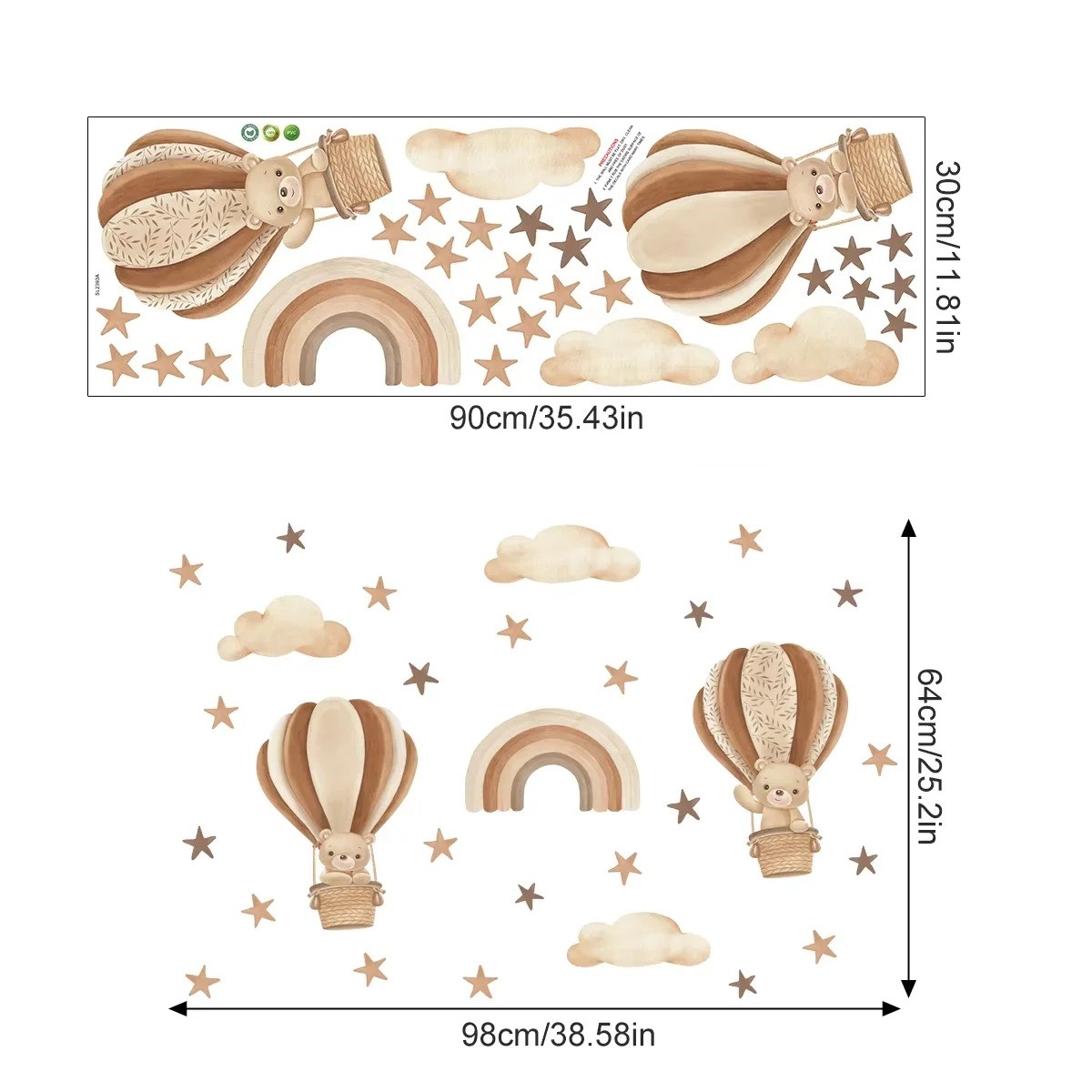 La pegatina de pared con el motivo de ositos en globos marrones es una hermosa decoración que aporta al cuarto infantil una atmósfera tranquila, suave y acogedora. Su tonalidad marrón tiene un efecto natural y armónico, por lo que se adapta perfectamente a interiores modernos y tradicionales. El vinilo mate translúcido asegura una fusión natural del motivo con el color de la pared y elimina los reflejos, creando así un aspecto elegante y discreto. La medida 98 x 64 cm ofrece un elemento decorativo lo suficientemente destacado que embellece el espacio sin abrumarlo. La aplicación es sencilla, la pegatina se adhiere bien y, al retirarla correctamente, no daña la superficie.