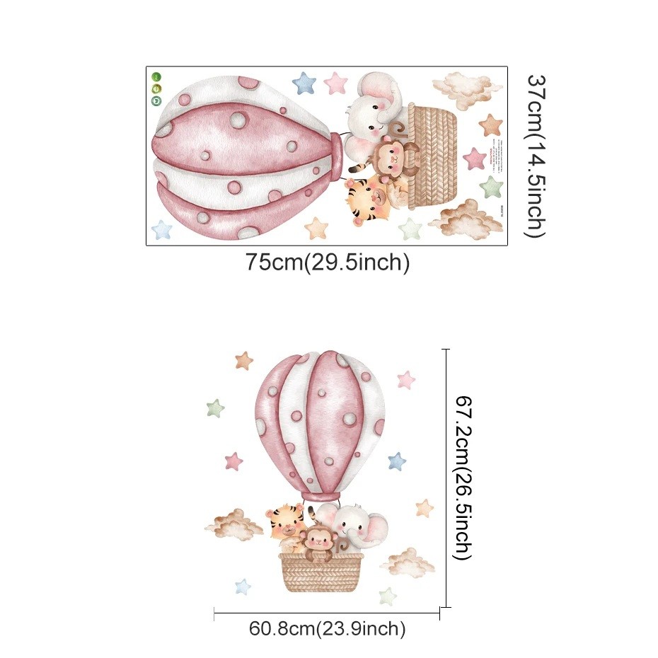 Pegatina de pared para habitación infantil 67,2 x 60,08 cm Tigre, mono y elefante en globo rosa decoración mural de vinilo mate translúcido