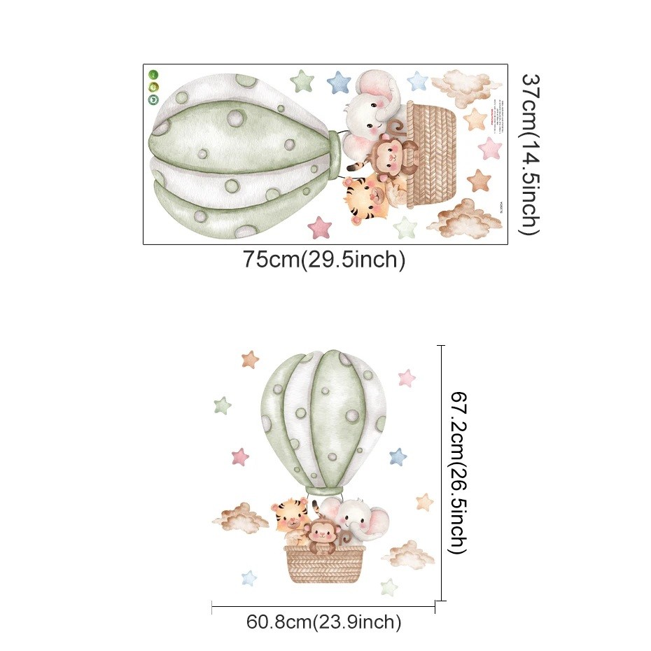 Esta decoración representa una manera sencilla de hacer acogedora la habitación infantil sin necesidad de pintar o perforar. El delicado diseño de los animales en el globo es universal – apto para niños y niñas y combina perfectamente con tonos naturales y pastel. Vinilo de alta calidad garantiza una larga vida útil y fácil mantenimiento.
