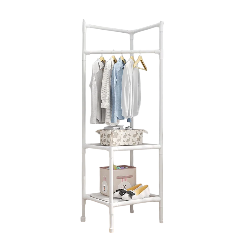 Práctico perchero de esquina con estructura metálica resistente y dos estantes de tela no tejida. Ideal para dormitorios, vestíbulos y armarios. Descripción completa