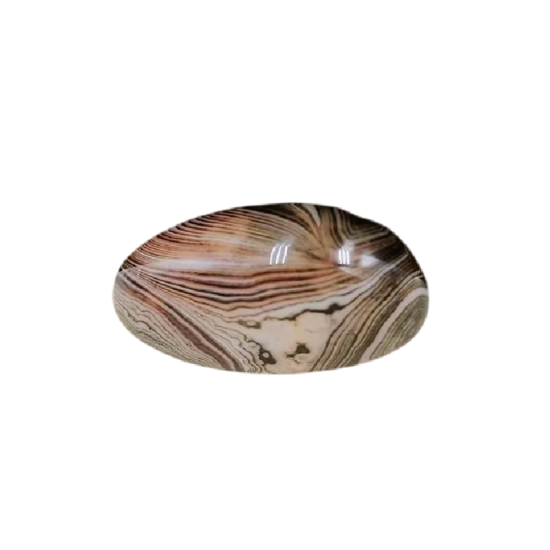 El ágata natural es uno de los minerales más hermosos, caracterizado por una rica estructura, un colorido único y una superficie lisa y brillante. Esta piedra pulida, con un peso de entre 70 y 90 g, destaca por su textura sedosa y la energía armoniosa que aporta al interior. Es perfecta como decoración, herramienta de meditación y pieza de colección . Cada pieza es original: sus rayas de colores y su diseño natural la convierten en un artefacto natural único.