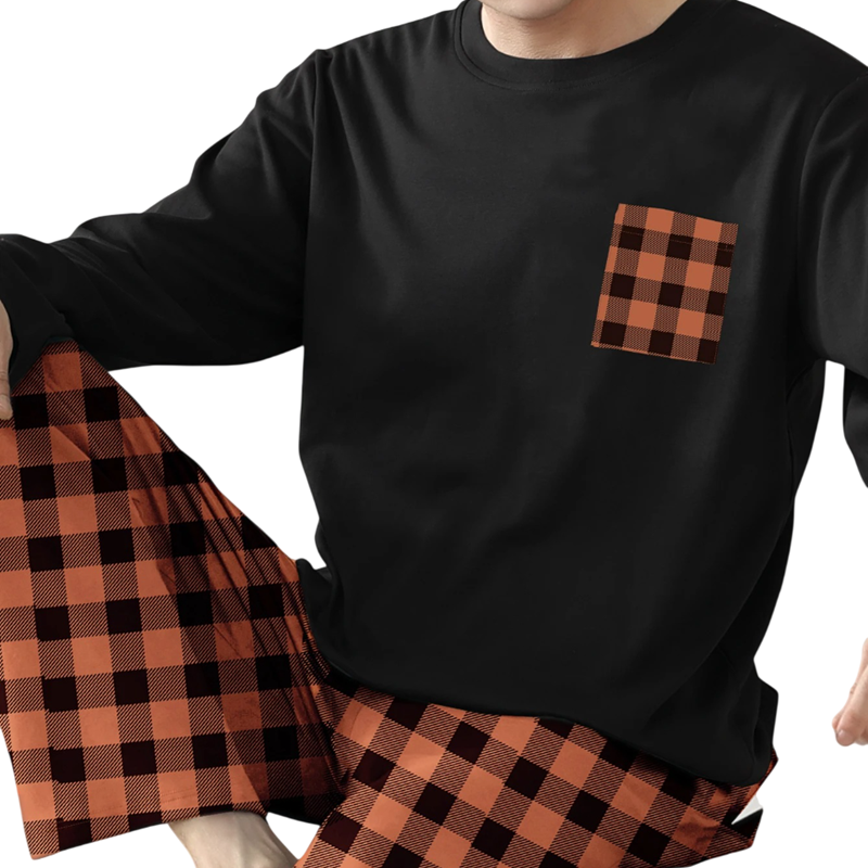Pijama de hombre de manga larga y pantalones a cuadros O cuello Poliéster Pijama cómodo con bolsillo para uso en casa