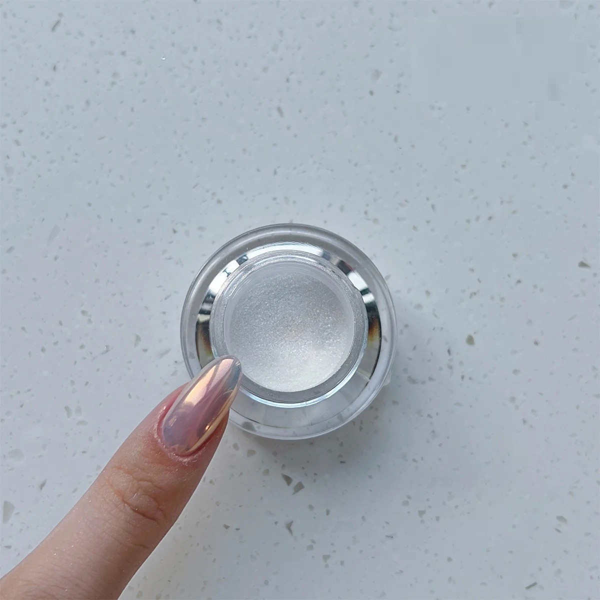 Polvo perlado suave que crea un elegante efecto aurora con alto brillo, ideal para nail art y fijación con top coat UV. Descripción completa