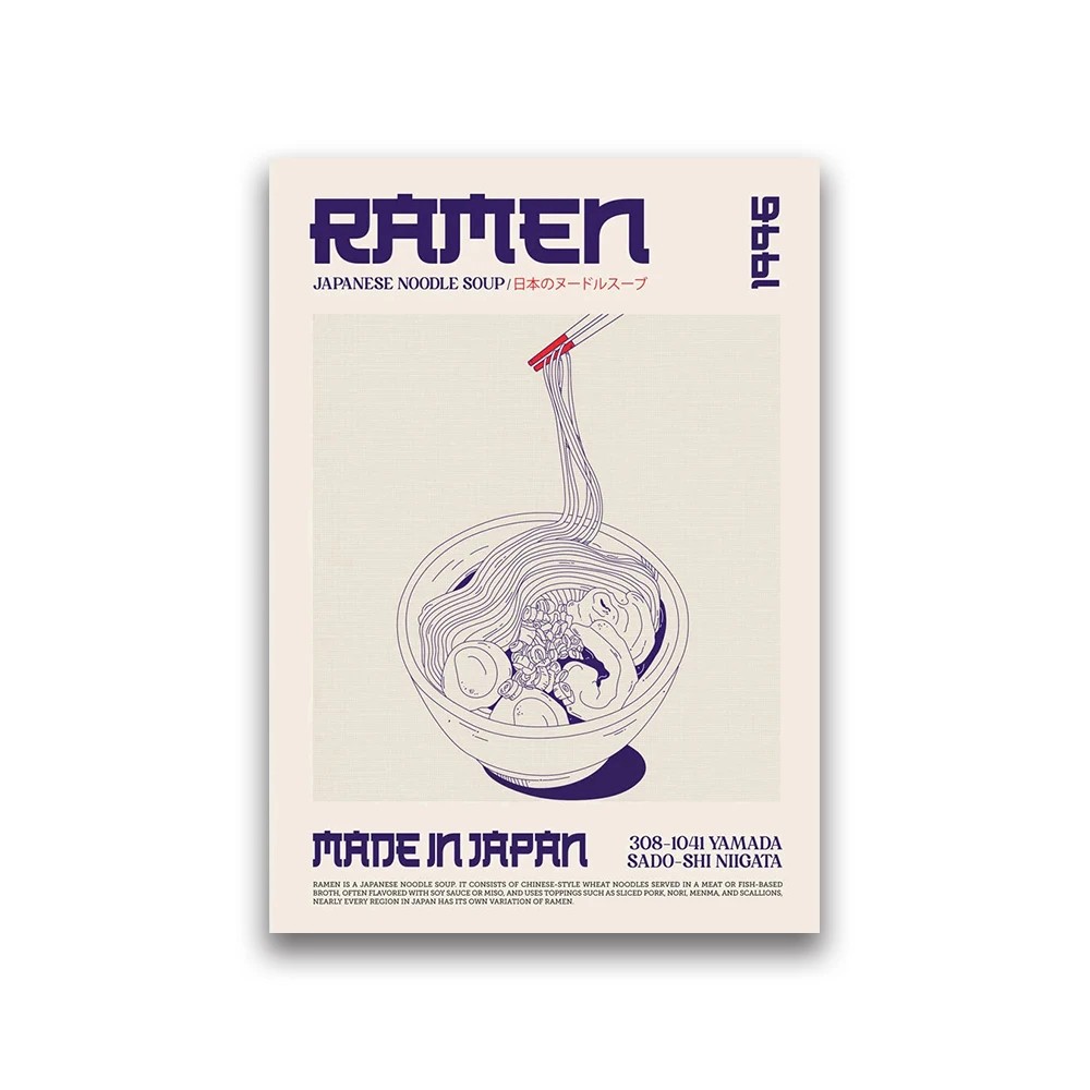 El motivo del ramen es un elemento característico de la cocina japonesa y puede complementar un interior enfocado en la gastronomía o temática asiática. El póster se puede usar solo o combinarlo con otros cuadros decorativos y pósters con motivos de comida. Gracias al estilo gráfico simple, es adecuado tanto para interiores domésticos como para espacios comerciales, como restaurantes o bistrós.