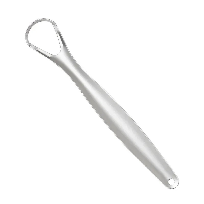 Práctico raspador de lengua de acero inoxidable con un pequeño anillo para una limpieza precisa. Ayuda a eliminar la capa de la lengua y promueve un aliento fresco. Descripción completa