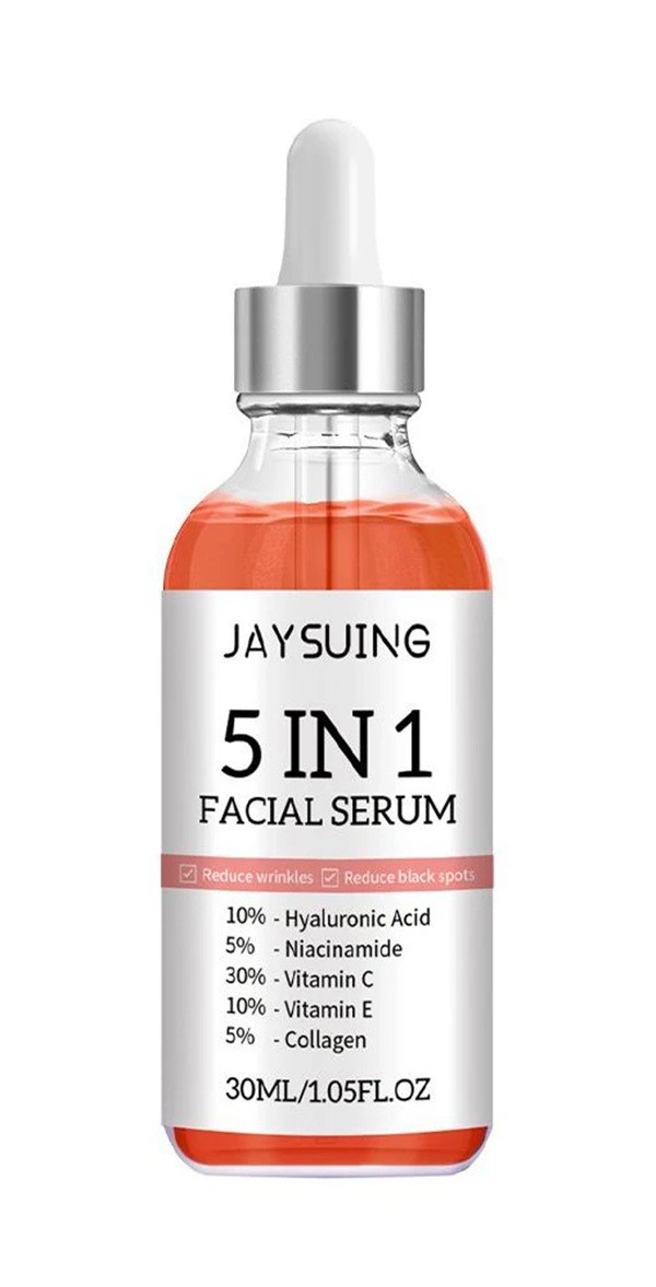 Este sérum facial multifuncional 5 en 1 está diseñado para un cuidado integral de la piel. Contiene 30 % de vitamina C, que promueve un tono de piel más claro y uniforme, reduce los signos de cansancio y contribuye a la protección contra los radicales libres. Gracias al 5 % de niacinamida, el sérum reafirma y suaviza la piel, mientras que el 10 % de ácido hialurónico proporciona hidratación intensa y apoya la elasticidad de la piel. La vitamina E al 10 % actúa como un potente antioxidante y el 5 % de colágeno ayuda a restaurar la firmeza y elasticidad de la piel.