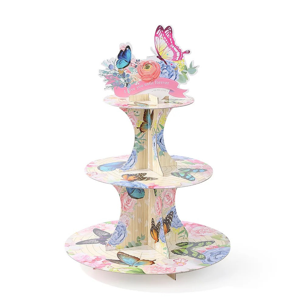 - Contenido del paquete: 1 × soporte de 3 niveles para cupcakes con motivo de mariposas