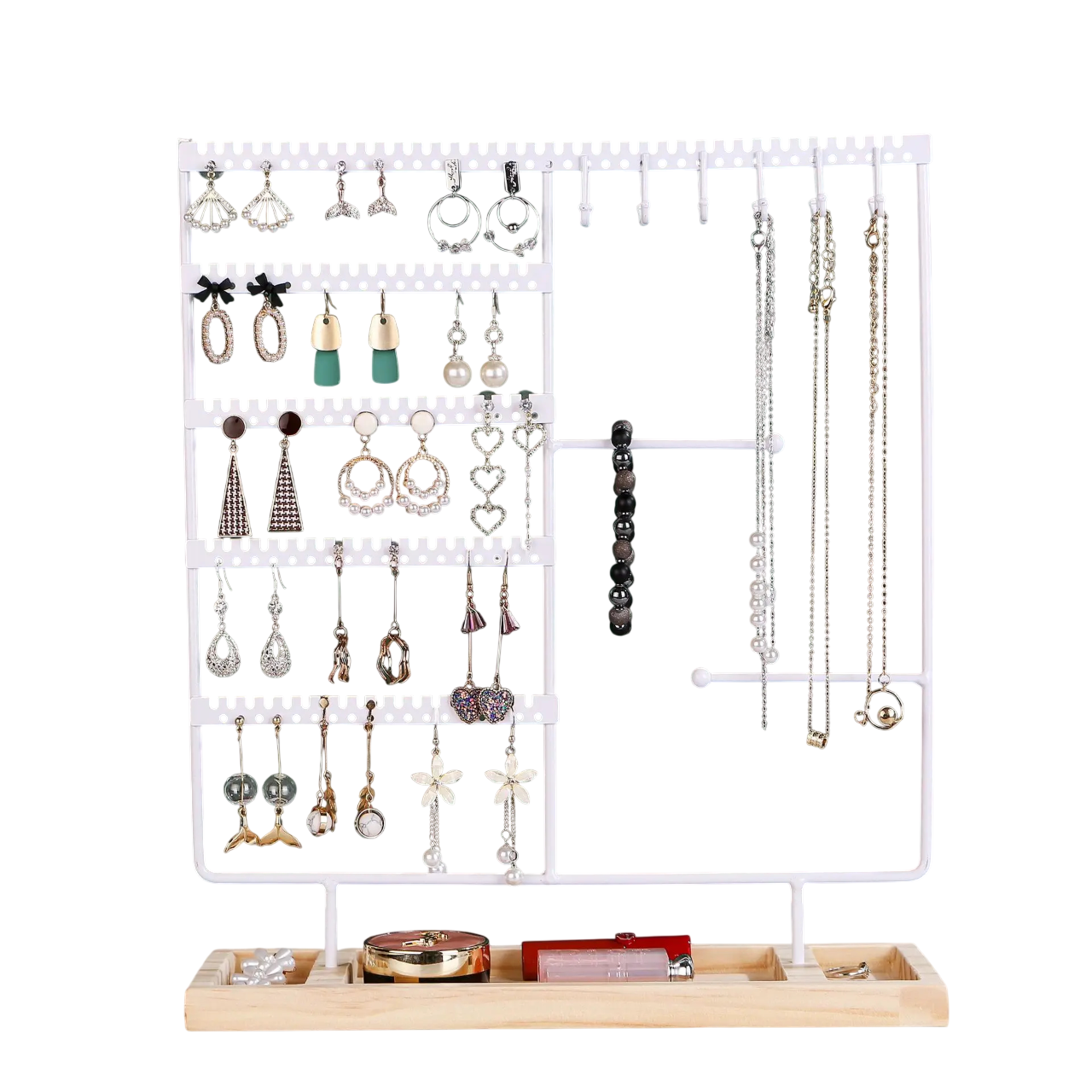 Práctico soporte para un almacenamiento ordenado de pendientes, collares y pulseras. Organizador de joyas de mesa con múltiples ganchos y base estable. Descripción completa
