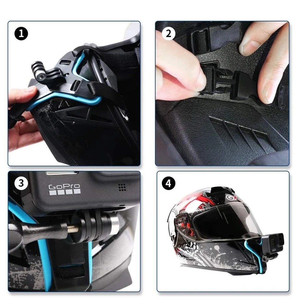 Instrucciones de instalación: 1. Coloque el soporte en la correa del casco o en el pecho y ajústelo según el ancho de la correa. 2. Cierre el clip para que el soporte se mantenga firme y no se deslice. 3. Fije la cámara al soporte usando el tornillo que asegura una conexión firme. 4. Verifique la estabilidad de la cámara para que no haya movimiento o balanceo durante el deporte. Este procedimiento asegura una sujeción firme y segura de la cámara durante diversas actividades deportivas.