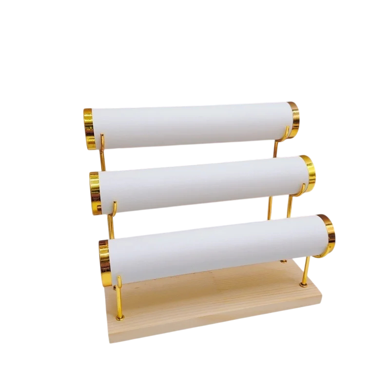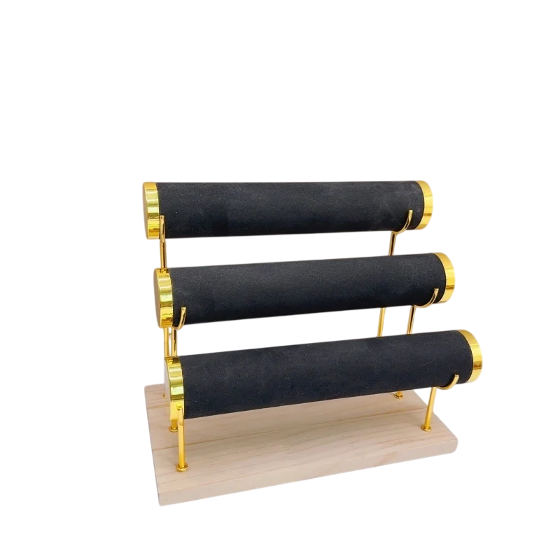 Este soporte está diseñado para una exhibición ordenada de pulseras, relojes y otras joyas. La construcción incluye tres soportes cilíndricos independientes, que están organizados en tres niveles uno sobre otro. Gracias a esto, ofrece más espacio para almacenar una mayor cantidad de joyas.