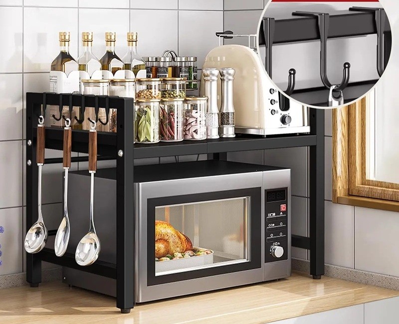 Soporte extensible para microondas 40–60 x 36 x 46 cm Negro Estante ajustable para cocina, organizador con ganchos