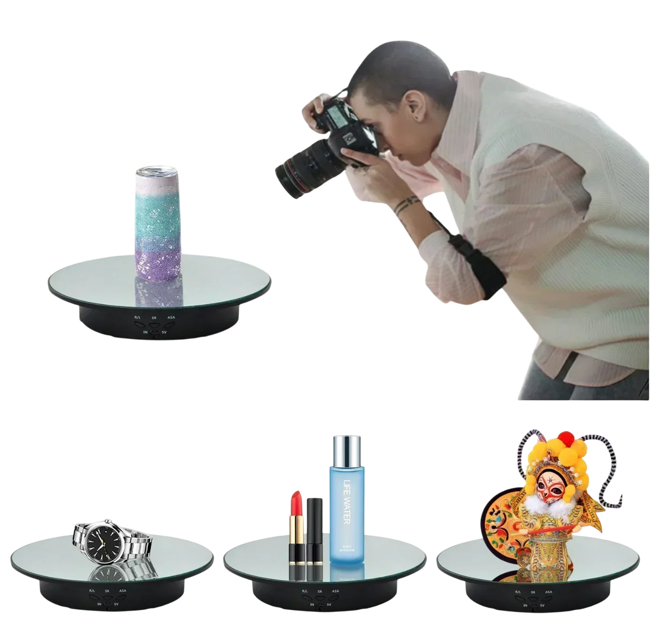 Soporte rotativo motorizado con superficie espejo y control remoto que permite una presentación fluida de productos. Ideal para fotografía, grabación y exhibiciones. Descripción completa