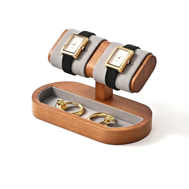 Este soporte está diseñado para un almacenamiento ordenado de dos relojes de pulsera y pequeñas joyas en un solo lugar. La construcción combina soporte de madera, dos almohadillas de cuero sintético para exhibir los relojes y un espacio de almacenamiento inferior para pequeños accesorios.