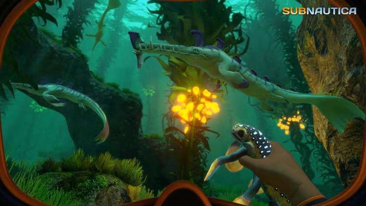 • Sumérgete en un enorme mundo submarino - Tras un aterrizaje de emergencia en un mundo oceánico alienígena, el único camino es hacia abajo. Los océanos de Subnautica van desde los poco profundos arrecifes de coral bañados por el sol hasta los traicioneros fosas oceánicas. Gestiona tu suministro de oxígeno mientras exploras bosques de algas, mesetas, arrecifes y sinuosos sistemas de cuevas. El agua rebosa vida: algo de ello es beneficioso, mucho de ello es dañino.