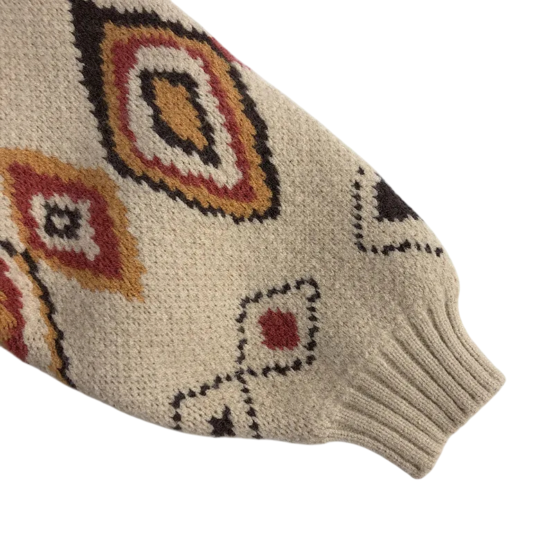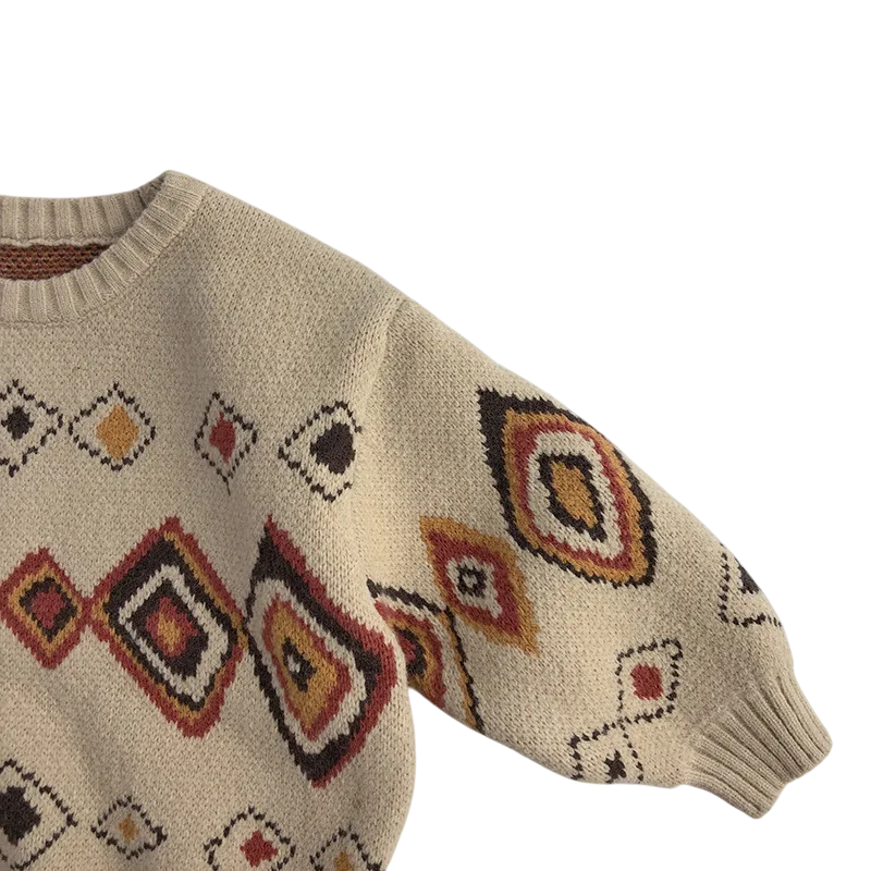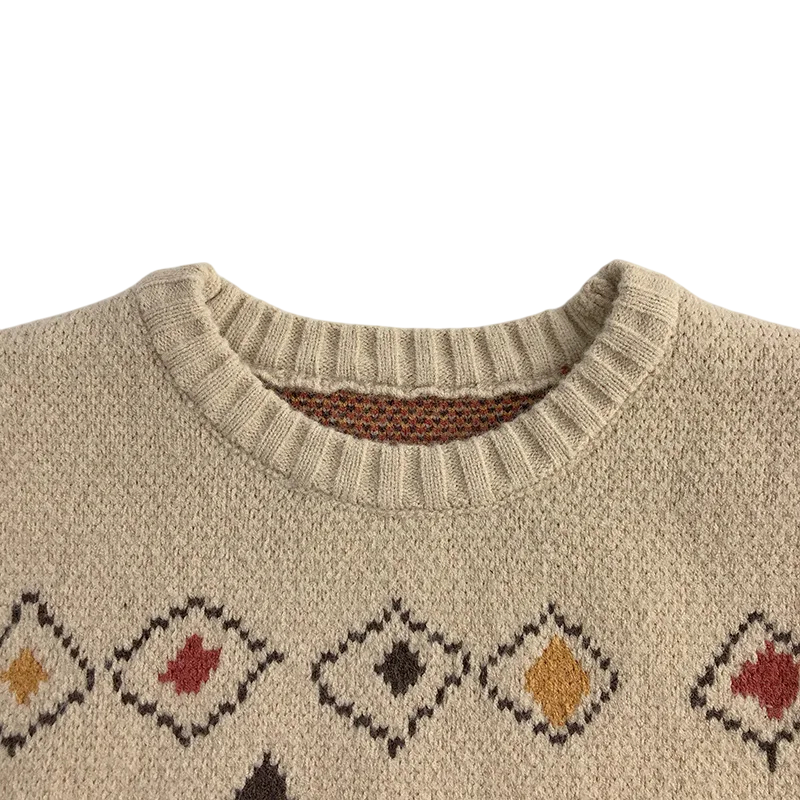 Este suéter retro infantil con patrón de cuadros de colores combina un clásico estilo vintage con materiales modernos y máxima comodidad. Fabricado con una mezcla de nylon y poliéster, proporciona un alto nivel de calidez y resistencia al desgaste. El tejido grueso y la suave superficie interna protegen al niño del frío y aseguran una sensación agradable incluso durante todo el día. El color base beige con patrón ornamental de colores le da al suéter un estilo único y lo convierte en una prenda destacada, pero aún así versátil, de ropa infantil. Este suéter es ideal para el otoño y el invierno y es adecuado tanto para niños como para niñas.