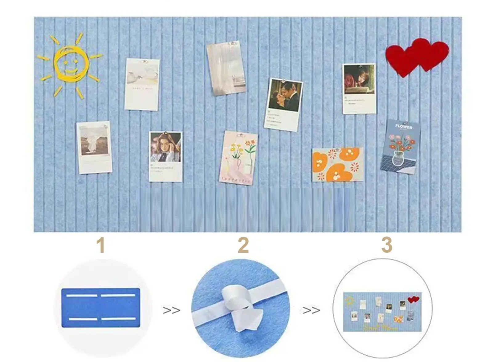 El tablero de fieltro sirve para sujetar de manera ordenada notas, fotografías o pequeños documentos. Gracias a su diseño sencillo en colores claros, puede funcionar como un organizador práctico y una decoración en la pared en la oficina, despacho o hogar.