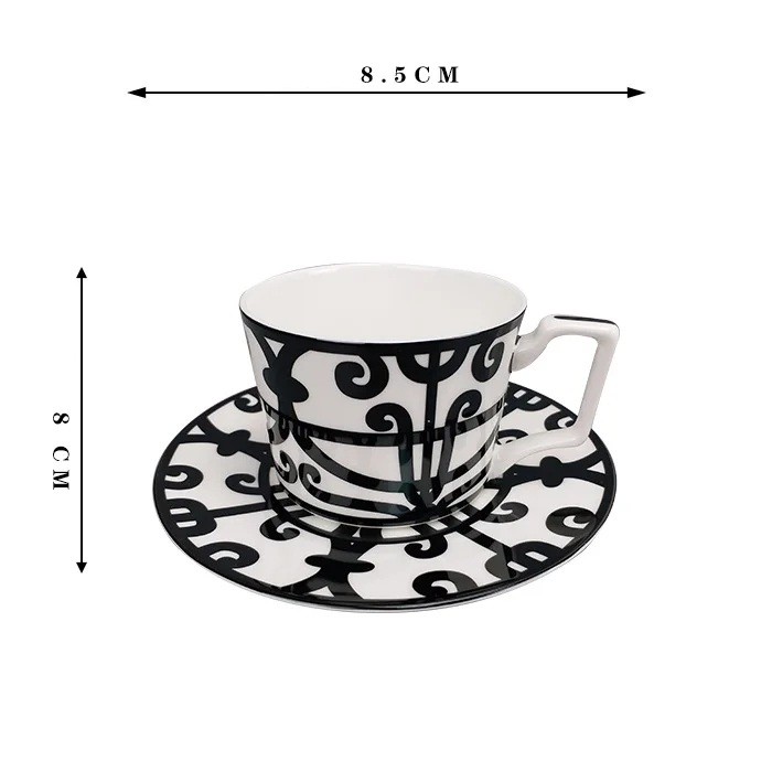 El diseño de la taza y el plato está adornado con un destacado patrón ornamental compuesto por líneas y formas curvas. Este motivo crea un interesante efecto visual y le da a la vajilla un carácter decorativo. La forma de la taza se complementa con un práctico asa que permite un agarre cómodo durante su uso.