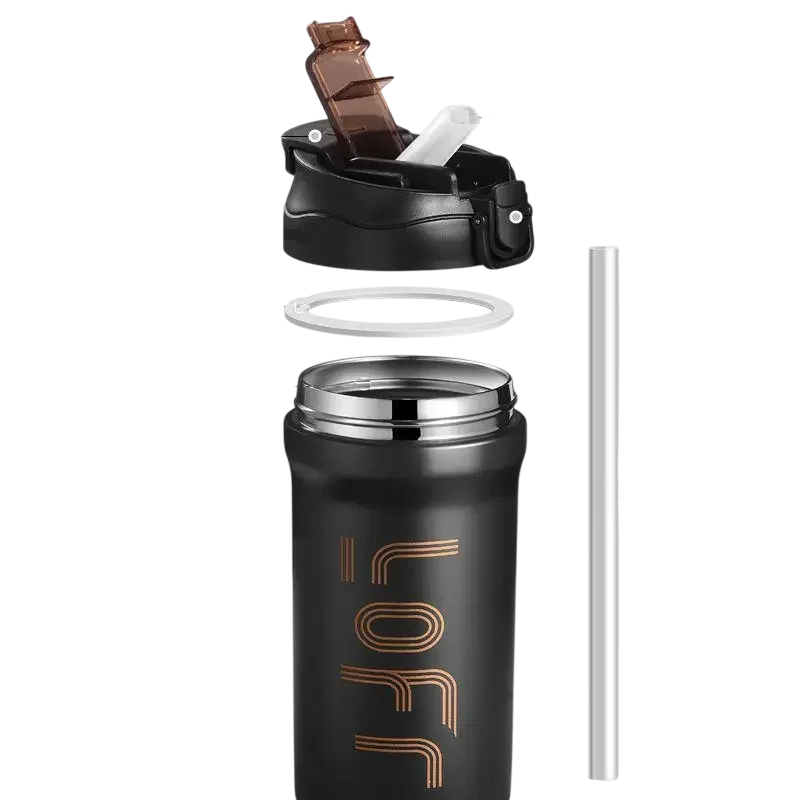 Termo aislante con doble bebida, pajita y abertura 600 ml, acero inoxidable 316/304, tapa con botón para café, té y uso diario