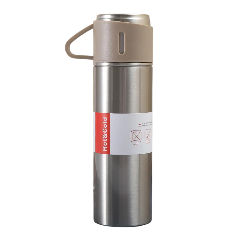 La construcción de acero inoxidable ayuda a mantener la bebida a la temperatura deseada durante más tiempo. Además, la taza integrada permite beber cómodamente sin necesidad de llevar utensilios adicionales.