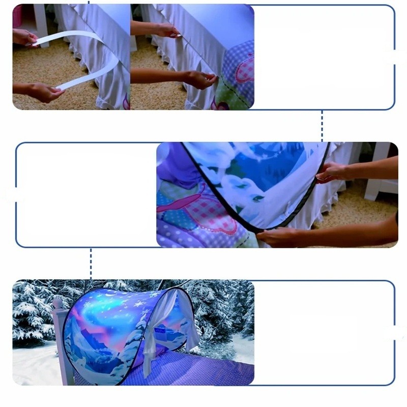 La suave tienda infantil para cama transforma cualquier habitación en un refugio mágico para un sueño y lectura tranquilos. Gracias a su práctico diseño plegable, se abre y se fija rápidamente a la cama, creando en un instante un lugar seguro y agradable donde el niño puede relajarse. La suave tela con diseño de unicornios genera una atmósfera acogedora que ayuda en el descanso nocturno y promueve un sueño más tranquilo. La tienda proporciona una sensación de privacidad y seguridad, lo que facilita el sueño incluso a los niños que duermen solos en su habitación. También es ideal como rincón de lectura, donde los niños pueden disfrutar de momentos agradables con sus libros favoritos.