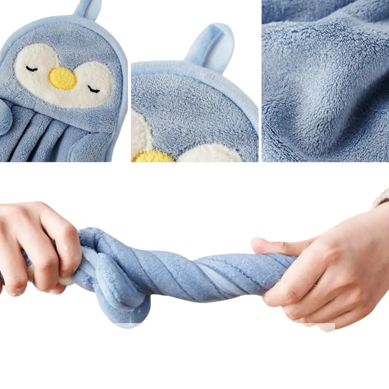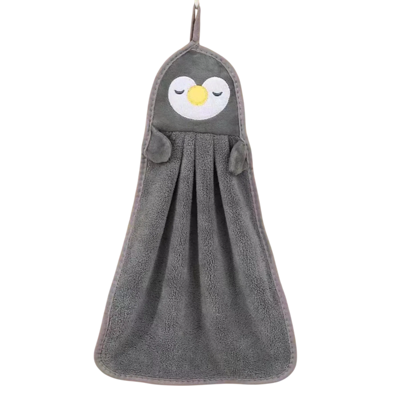 Linda toalla infantil con diseño de pingüino y asa práctica, ideal para el baño y la guardería para el secado diario de manos. Descripción completa