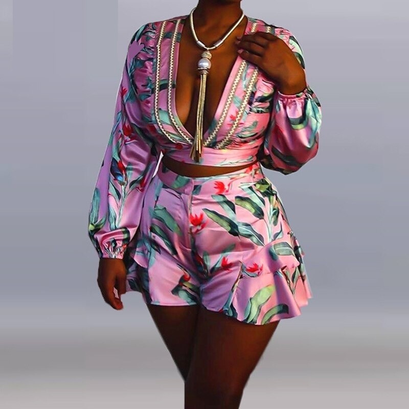 Top corto y shorts florales para mujer B1239