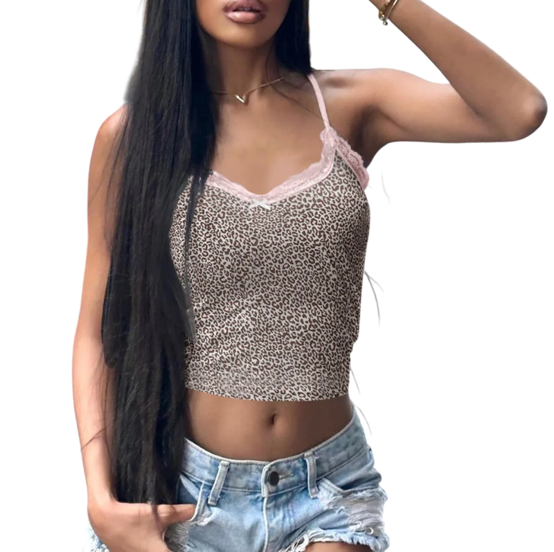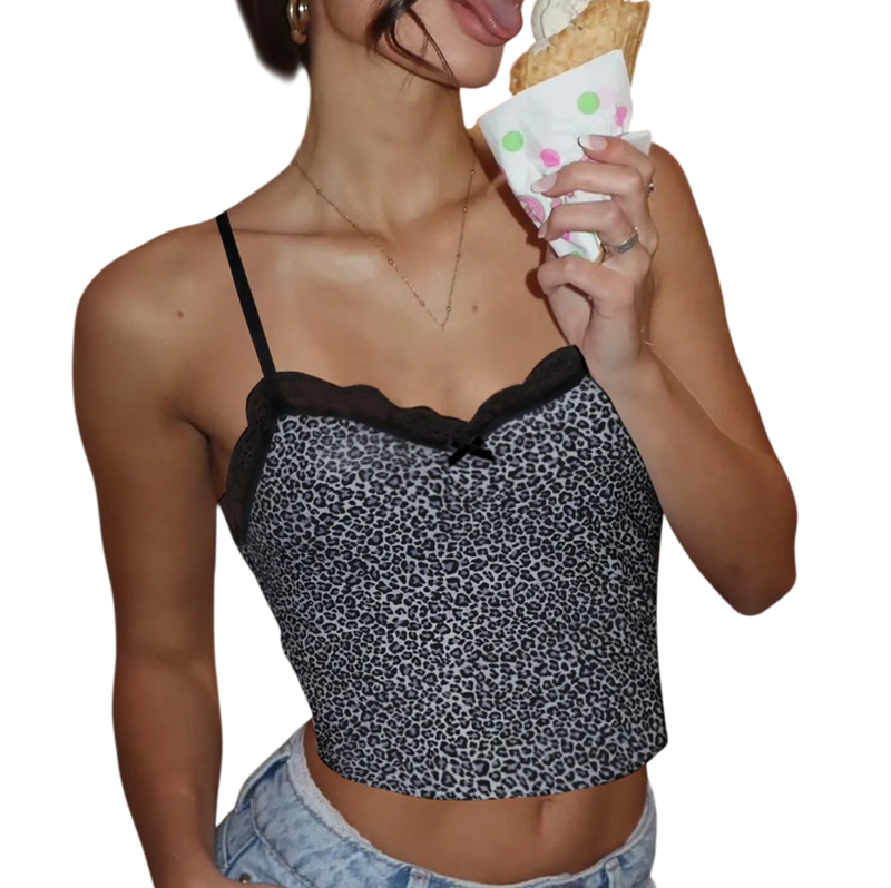 Top de mujer con estampado de leopardo Escote redondo con lazo y encaje Tirantes finos Poliéster spandex top elástico de verano Descripción completa