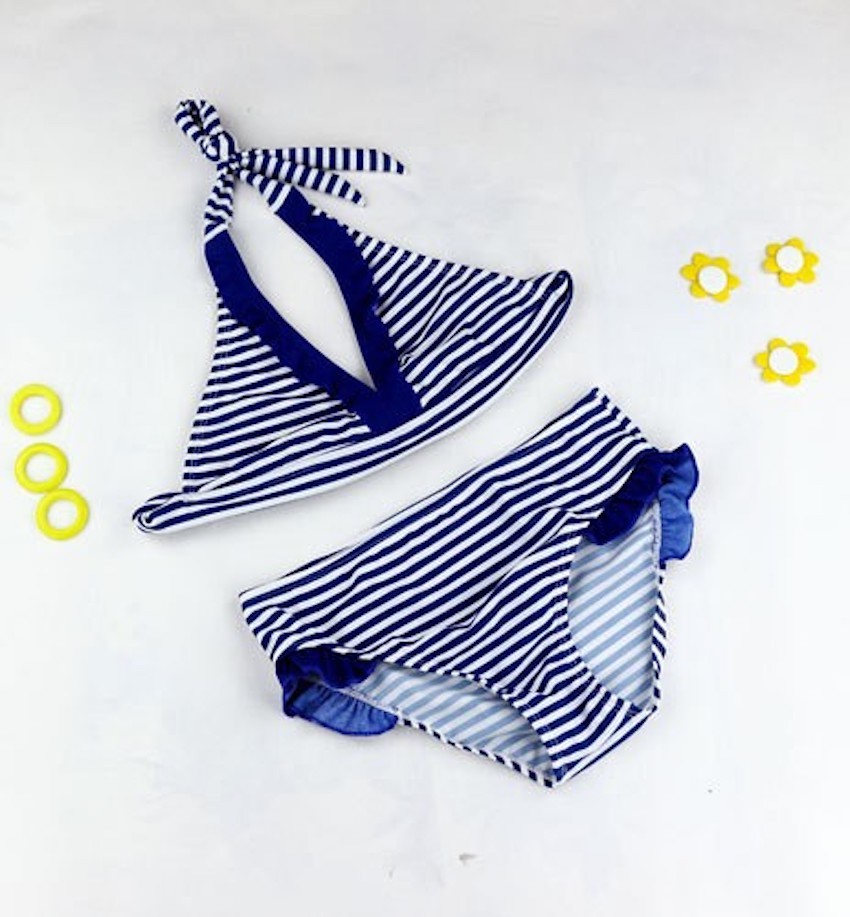 ¡Este hermoso traje de baño de dos piezas con estampado de rayas es una excelente opción para cualquier jovencita!