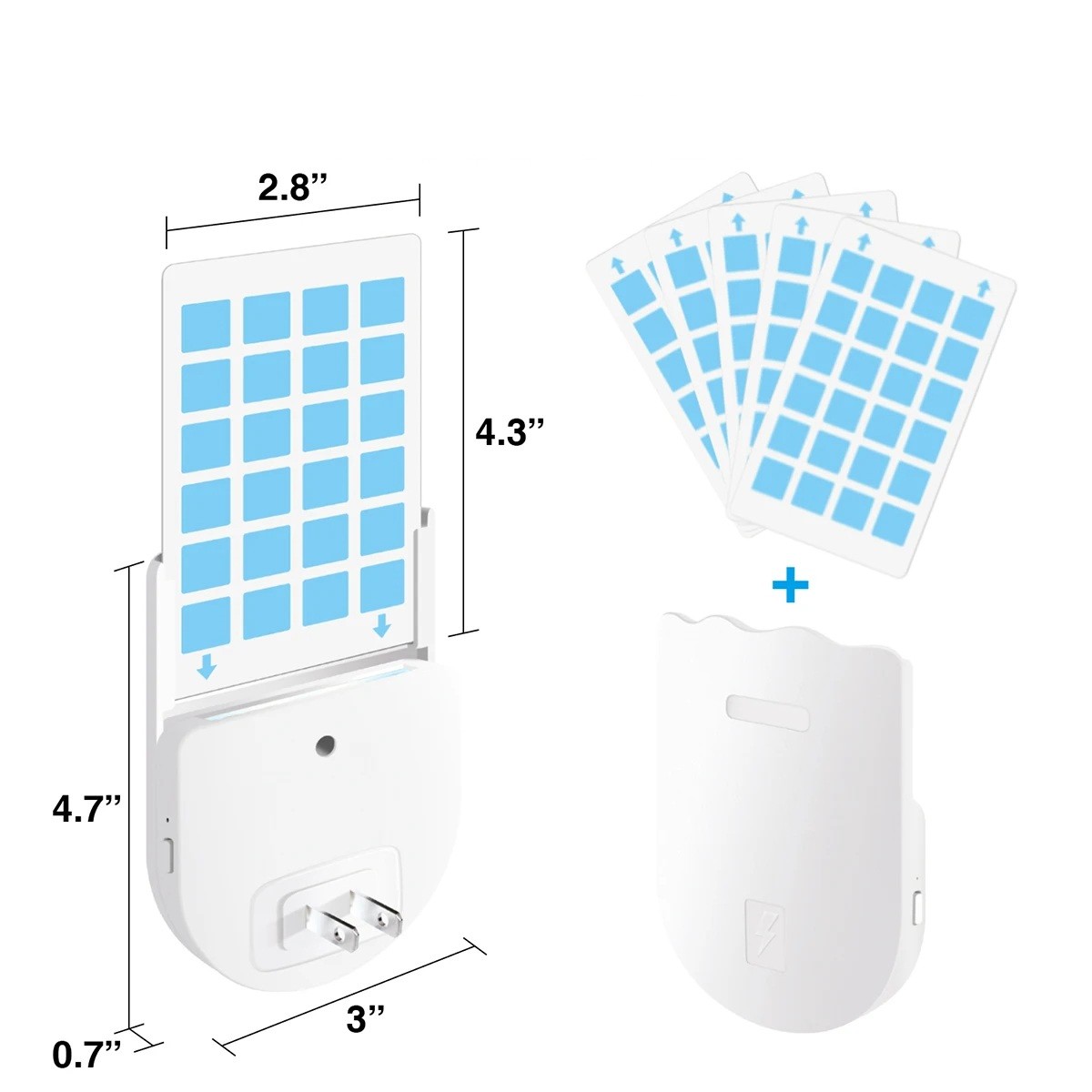 El dispositivo está equipado con una placa adhesiva que captura insectos sin el uso de sustancias químicas. La trampa adhesiva funciona con el principio de captura no química de insectos. El paquete también incluye placas adhesivas de repuesto.