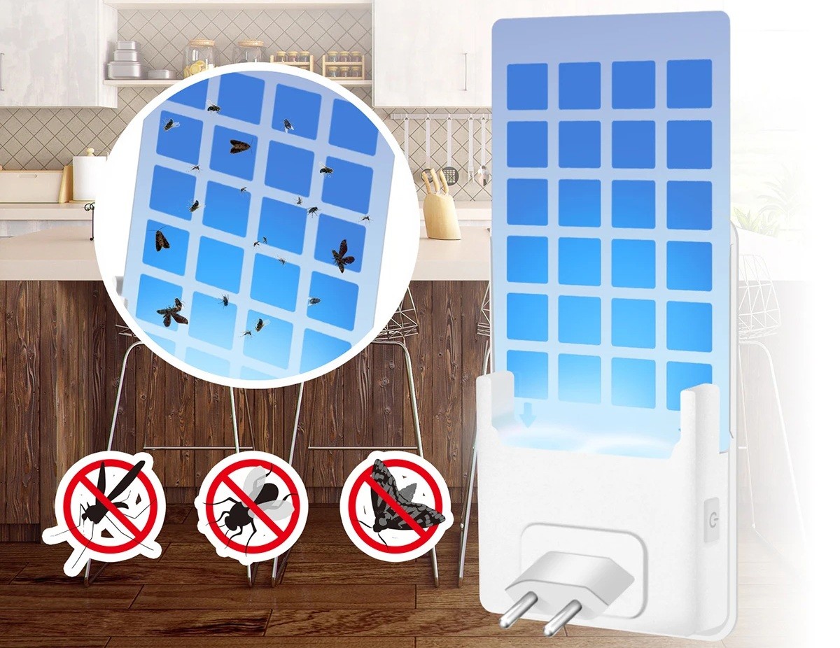 La trampa combina la función de captura de insectos y una pequeña lámpara nocturna. Al conectarse a la toma de corriente, se activa automáticamente la luz UV azul, que atrae a los mosquitos. Con un botón, se puede cambiar a luz cálida, que funciona como iluminación nocturna.