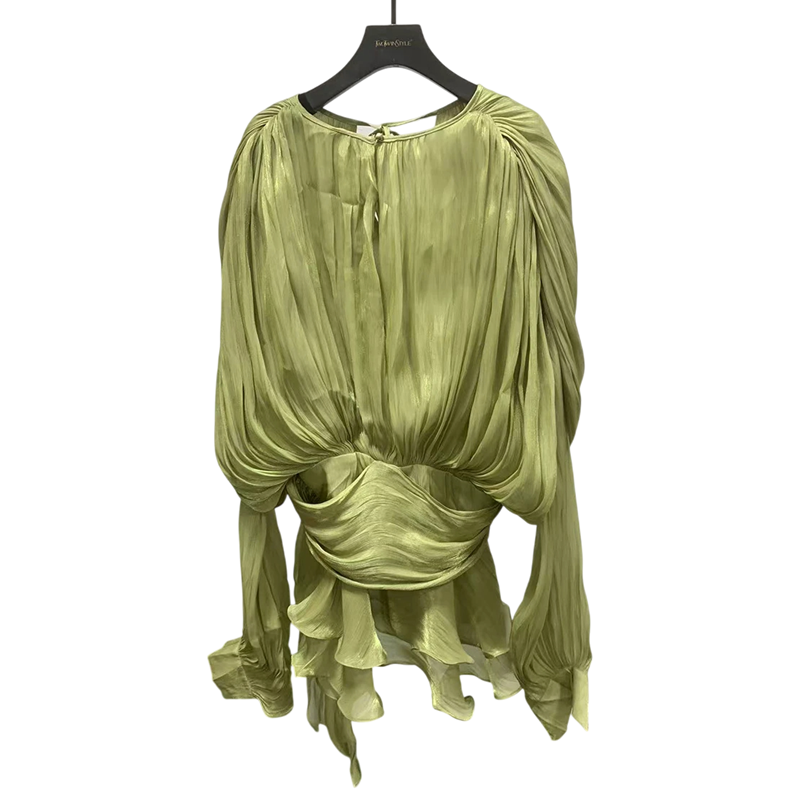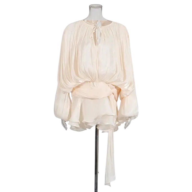 Este elegante minivestido en un tono sutil es la elección perfecta para cualquier ocasión en la que quieras brillar. La combinación de un top voluminoso con mangas abullonadas y una falda ligeramente fruncida crea un efecto de silueta único y elegante. La parte superior tiene un escote más profundo con un lazo sutil en el cuello, que añade un toque de sofisticación. El vestido está hecho de un material ligero y fluido que luce lujoso y es cómodo de llevar. Gracias a la cinturilla envolvente, el vestido se puede ajustar fácilmente a tu figura.