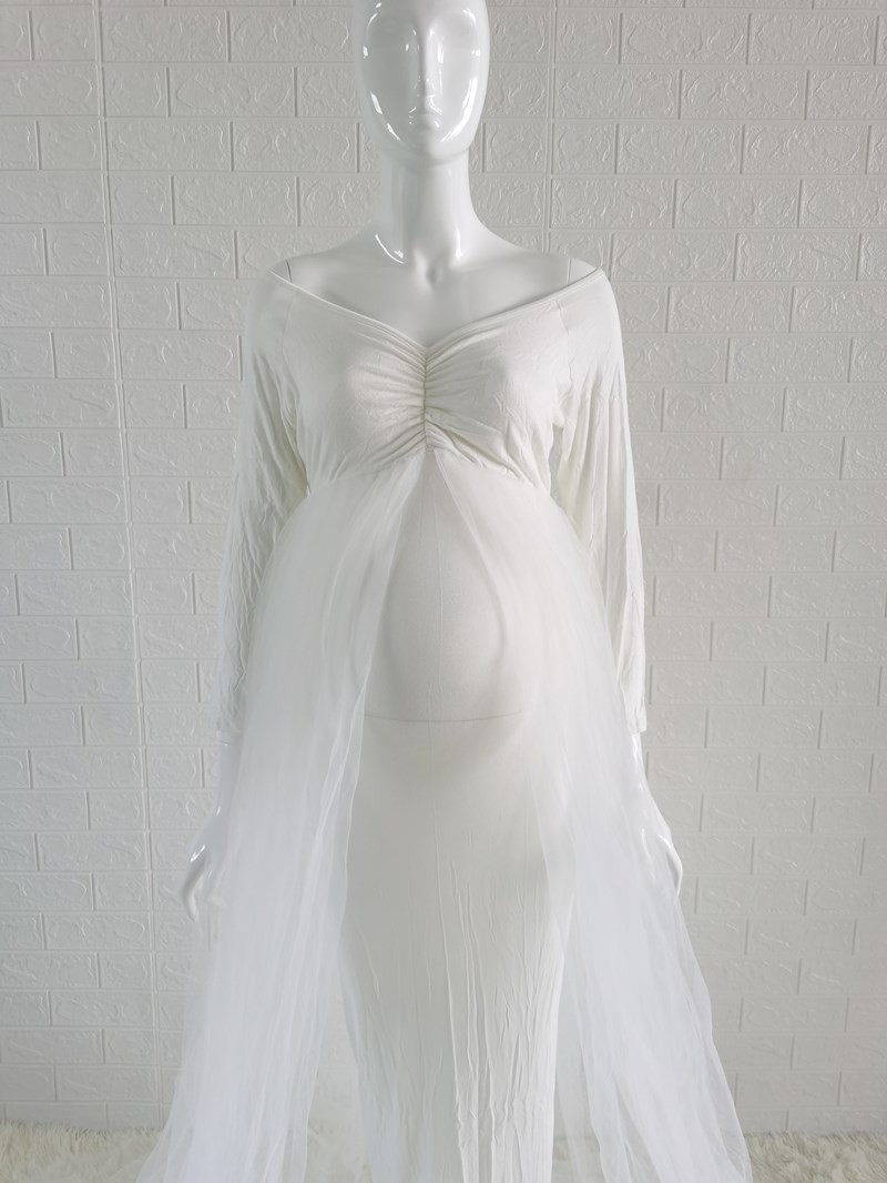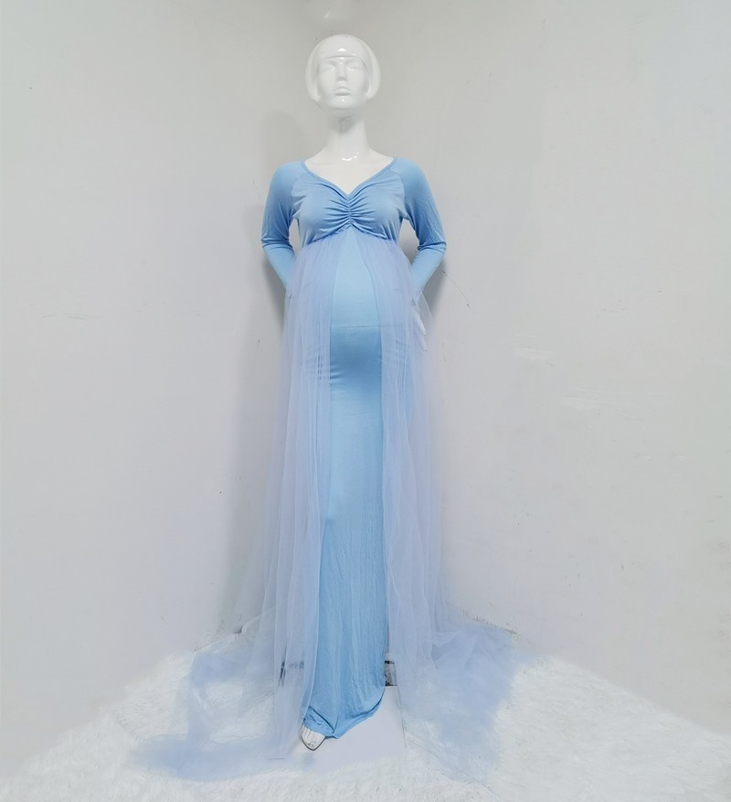 El vestido tiene mangas largas y una cola que llega hasta los tobillos. Son adecuados para sesiones de fotos de maternidad. El largo del vestido llega hasta los tobillos.