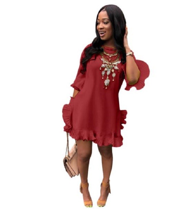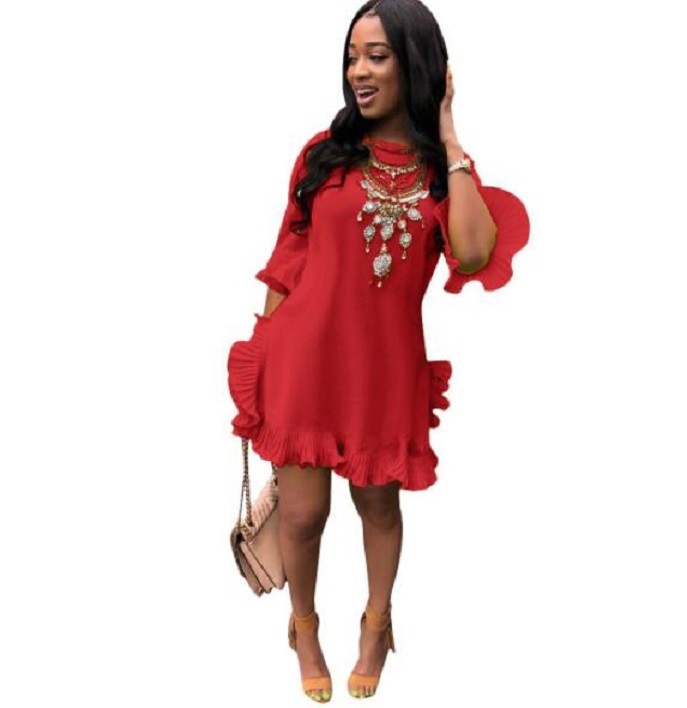 Falda y extremos de mangas con volantes. Corte moderno en el cuello.