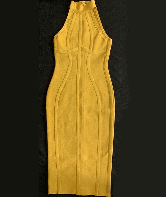 Vestido vendaje moderno con cuello halter y hombros descubiertos.