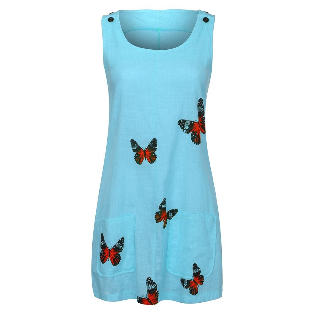 Hermoso vestido de verano sin mangas con un delicado estampado de mariposas.