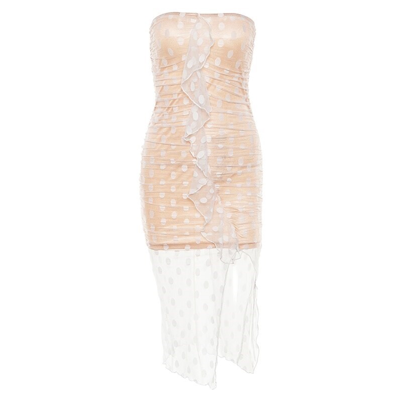 Hermoso vestido de verano de lunares sin tirantes y con abertura alta.