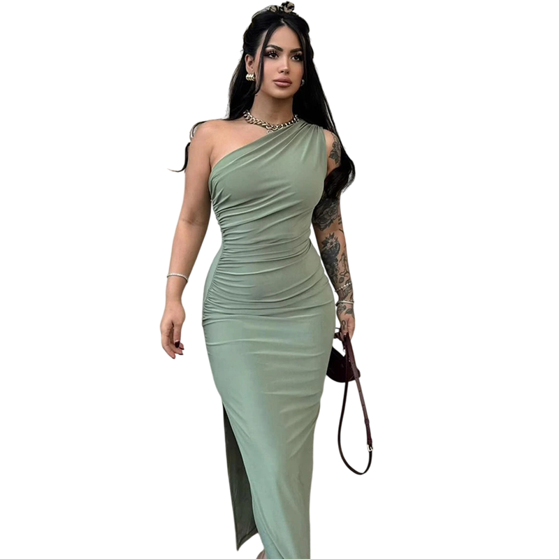Elegante vestido largo con tirante asimétrico y abertura que acentúa tu figura y es ideal para eventos de noche y ocasiones formales. Descripción completa