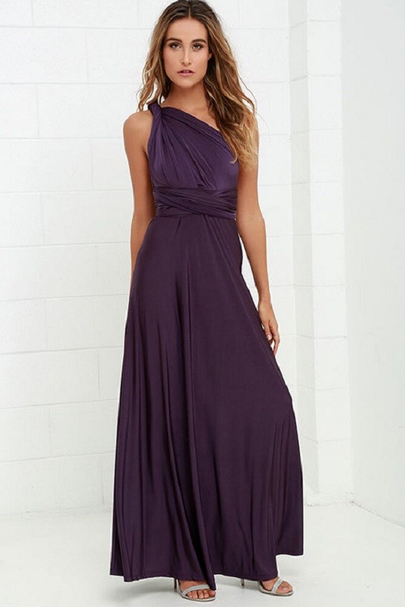 Hermoso vestido de noche largo confeccionado en material liso y brillante.
