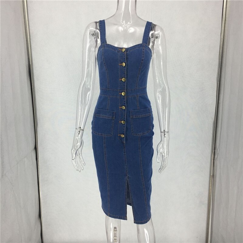Elegante vestido vaquero con tirantes y largo hasta la rodilla.